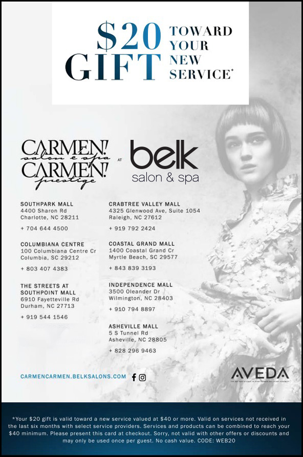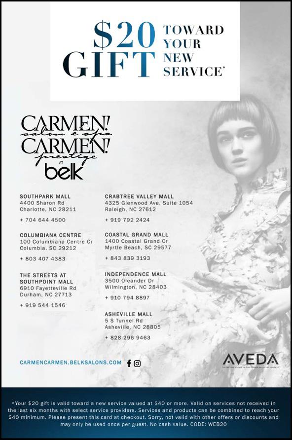 Welcome to the face of beauty and the art of relaxation, Carmen! Carmen! Prestige at Belk Style, a family of Aveda Concept Salons. Our talented team of stylists and spa professionals are committed to providing each guest with the ultimate Aveda experience whether you are looking for a modern cut, the latest trend in color, or simply an hour of serenity. With eight locations across the Carolinas we look forward to serving all of your beauty needs. Come visit us today to look and feel your most beautiful self.